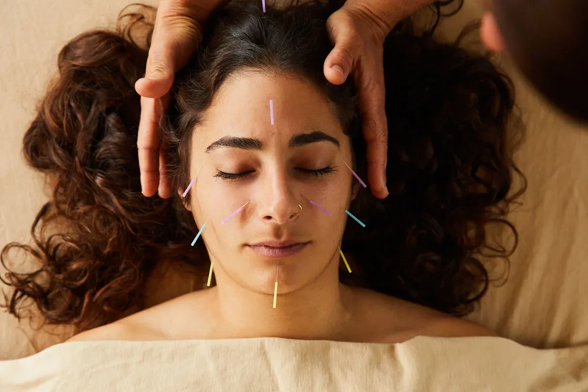 High angle of a woman lying on a table in an alternative medicine spa having an acupuncture and reiki treatment done on her face by an acupucturist